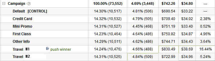In this case, we still have the same 2.38% lift, but we can see that in a larger context, that is only the 3rd best option out of the 7 different ones we are looking at. Had we failed to set-up the campaign to look for the larger context, the new would have thought we were accomplishing something, while in reality we would have been throwing away 14% lift (16.44% – 2.38%). Would your pat yourself on the back if you were reporting a 14% net loss to the business? Do we reward you for the 2% gain or the 14% loss? This is a real world situation, but this plays out all the time when you fail to look past opinions and you only test what someone is asking for or wants to see win. We fail to get perspective, so we are leaving winners our there left and right, winners that would dramatically impact the entire business. Why then is it ok to validate some basic “hypothesis” without diving into the larger context and looking for the best answer?