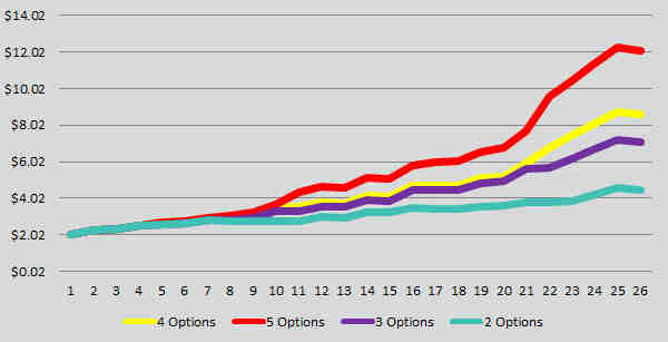 Overtime, this can have massive impact to the bottom line of any business. Here is a breakdown of a random number generator using normal distribution and the power of options (you only choose the best performer) looking at the impact of having 2, 3, 4, and 5 recipes in all your tests: